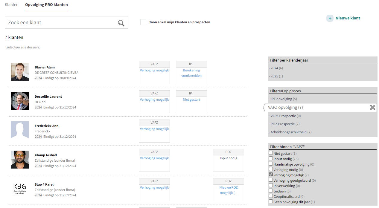 Of je kan steeds rechtstreeks naar de klantenlijst gaan en gebruik maken van de filters rechts (zie voorbeeld hieronder).