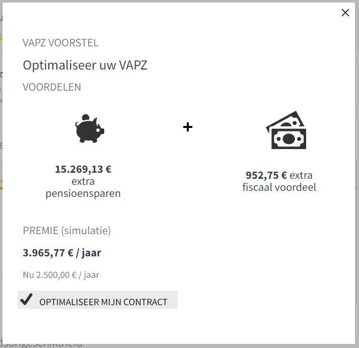 Als de klant daarop doorklikt, krijgt hij meer detail over de huidige premie, nieuwe premie, extra pensioenkapitaal en fiscaal voordeel.