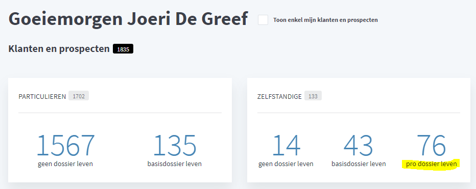 In de voorbeeld-cijfers van het dashboard zie je dus in totaal 13 klantendossiers die jaarlijks worden geprospecteerd voor VAPZ, waarvan 6 opportuniteiten te behandelen, 4 te checken door de klant en 0 afgehandeld.