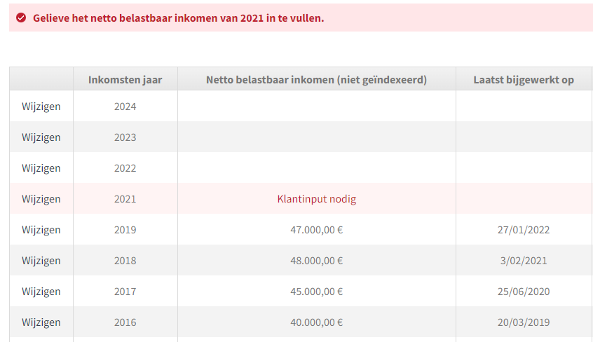 Voor een gevestigde zelfstandige (minstens 3 volledige jaren van sociale bijdragen), wordt gevraagd naar het (niet-geïndexeerd) netto belastbaar beroepsinkomen van 3 jaar geleden. Dit wordt duidelijk aangegeven in het systeem (zie voorbeeld hieronder). Tijdens de berekening van de maximale VAPZ premie zal het bedrag automatisch worden geïndexeerd door e-GOR zelf.