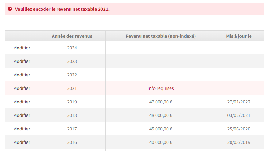 Il est possible que le revenu ait fortement baissé en 2020 (l'année de Covid19) et que le revenu soit remonté en 2021. Si vous constatez cela, la prime devrait être réduite pendant 1 an pour éviter tout risque lors d'un contrôle fiscal. Cependant, votre rôle de conseiller est de bien informer votre client et c'est à lui de prendre une décision en connaissance de cause. Si le client décide de maintenir la prime, documentez cette décision dans e-GOR.