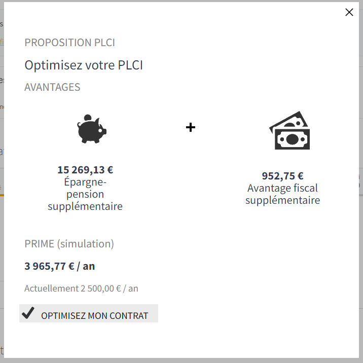 Si le client clique sur ce bouton, il obtient plus de détails sur la prime actuelle, la nouvelle prime, le capital retraite supplémentaire et l'avantage fiscal.